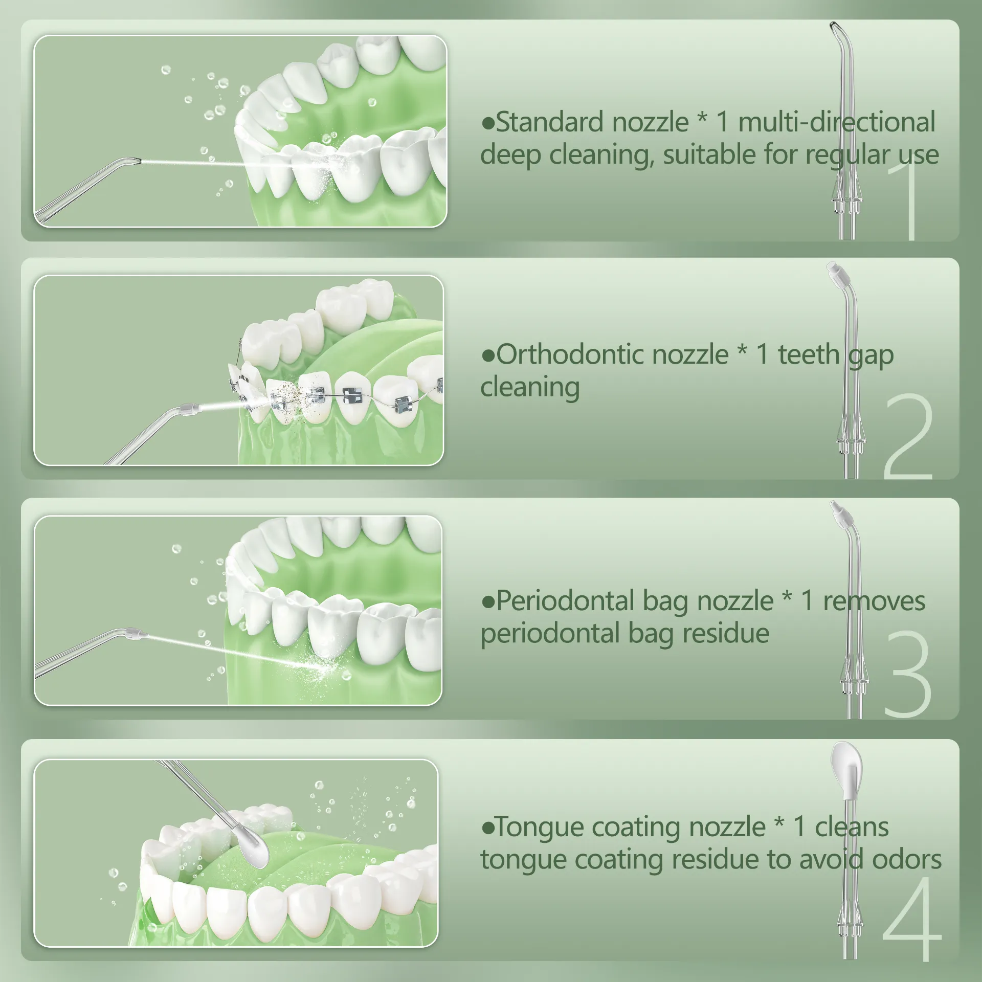 Full Oral Coverage with This Oral IrrigatorEquipped with 4 specialized nozzles (standard/orthodontic/periodontal/tongue coating), this oral irrigator handles daily cleaning, braces gaps, gum pockets, and bad breath sources all in one.