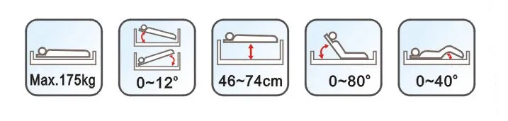 ORT3239WZF4 5 Functions Electric Inclinable Bed Flat ABS Bed Panel Elevating ABS Guardrail Powder Coating Mild Steel Frame Detachable ABS Head And Foot Board Central Control Locking Castor Packing Size:224x104x49 Over All size:228x108Product Detail