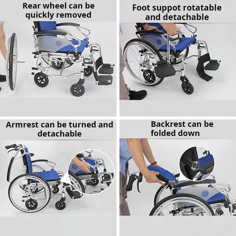 3.Rear wheel: 22-inch PU wheel with quick release function, also equipped with two 8-inch auxiliary wheels. When the big wheel is removed, the small wheel can be used for walking, which is convenient for the wheelchair to directly enter the narrow place;